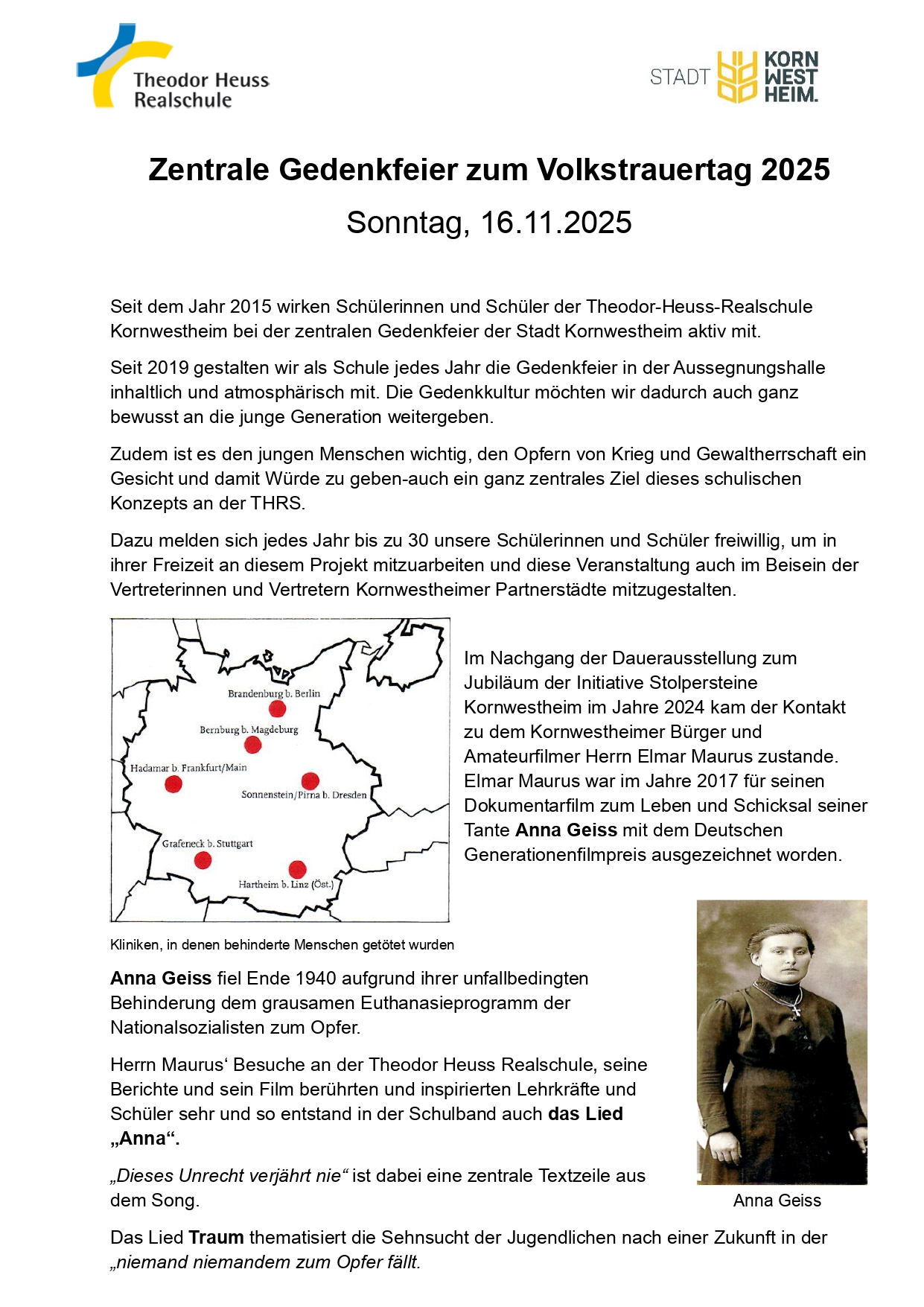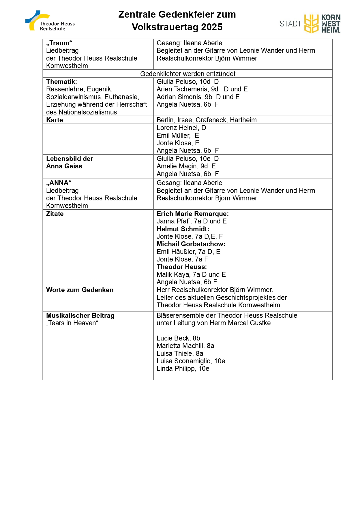Zusätzlich zu dem inhaltlichen Teil während der Feier in der Aussegnungshalle tragen unsere Schülerinnen und Schüler jedes Jahr die 5 Kränze für die Stadt Kornwestheim und die der 4 Partnerstädte von der Aussegnungshalle zum Mahnmal.